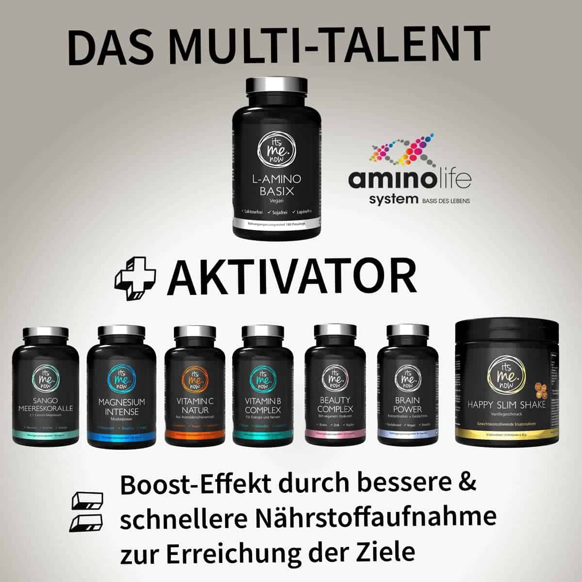 Der L-AMINO BASIX ist Grundlage des aminolifesystems. Durch seine einzigartige Zusammensetzung unterstützt er die weiteren Kombinationsprodukte in ihrer Effektivität und dient als zusätzlicher Aktivator. Für den ultimativen BOOST-EFFEKT!